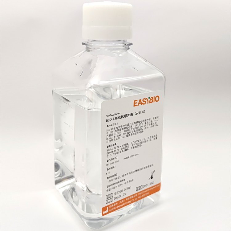 TAE 是生物学中使用最广泛的核酸电泳缓冲液,主要用于 DNA 的琼脂糖凝胶电泳。TAE 的主 要成分是 Tris-乙酸盐与 EDTA,电泳时双链线状 DNA 的迁移率较快,电泳大于 13kb 的片段时分离效果好,此外,回收 DNA 片段时也宜用 TAE 缓冲系统进行电泳。